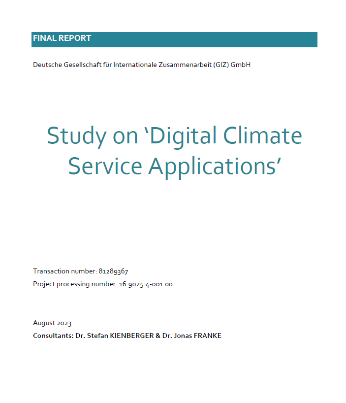 The ‘Digital Climate Service Applications’ study report presents the outcomes of an in-depth investigation conducted by consultants in close cooperation with GIZ between November 2022 and August 2023. The primary aim of this study was to assess the existing trends and prospects concerning the technical, service, and institutional capabilities of Digital Climate Service Applications (DCSAs). The study aimed to offer valuable decision support to potential users, including institutions of the German development cooperation and public authorities in partner countries, to enhance data-driven climate risk assessments.
