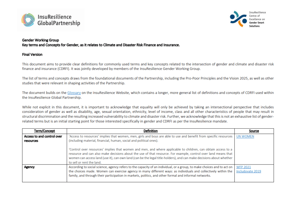 This document aims to provide clear definitions for commonly used terms and key concepts related to the intersection of gender and climate and disaster risk finance and insurance (CDRFI). It was jointly developed by members of the InsuResilience Gender Working Group. The list of terms and concepts draws from the foundational documents of the Partnership, including the Pro-Poor Principles the Vision 2025, and the Declaration on Gender, as well as other studies that were relevant in shaping activities of the Partnership.