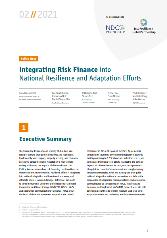 The increasing frequency and severity of disasters as a result of climate change threatens lives and livelihoods, food security, water supply, property security, and economic prosperity across the globe. Adaptation is vital to make society resilient to the impacts of climate change. This Policy Note examines how risk financing considerations can enhance vulnerable economies’ resilience efforts if integrated into national adaptation and investment processes, and efforts to address loss and damage.