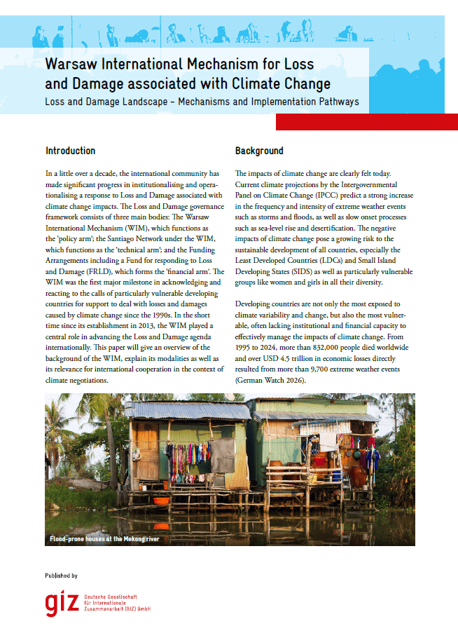 The Loss and Damage governance framework consists of three main bodies: The Warsaw International Mechanism (WIM), which functions as the ‘policy arm’; the Santiago Network under the WIM, which functions as the ‘technical arm’; and the Funding Arrangements including a Fund for responding to Loss and Damage (FRLD), which forms the ‘financial arm’. This factsheet will give an overview of the background of the WIM, explain its modalities as well as its relevance for international cooperation in the context of climate negotiations.