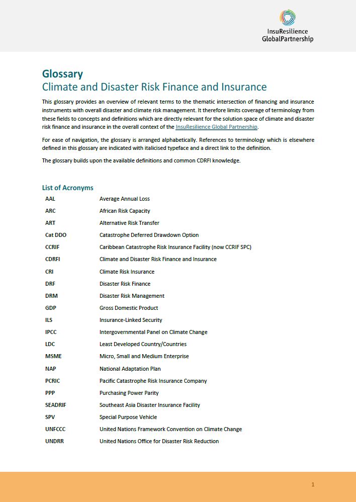 This glossary provides an overview of relevant terms to the thematic intersection of financing and insurance instruments with overall disaster and climate risk management. It therefore limits coverage of terminology from these fields to concepts and definitions which are directly relevant for the solution space of climate and disaster risk finance and insurance in the overall context of the InsuResilience Global Partnership.