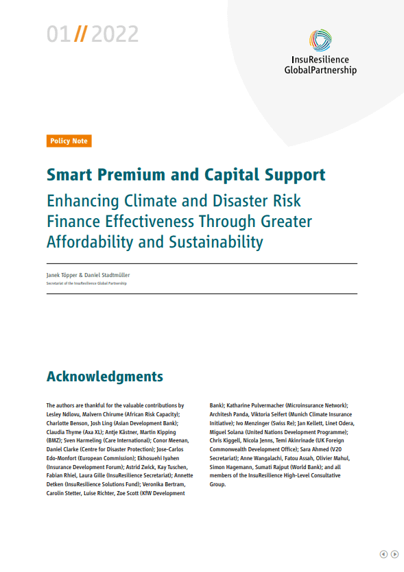 Climate and disaster risk finance and insurance (CDRFI) promises substantial resilience benefits. The Policy Note aims to present a common understanding among InsuResilience members and partners regarding recipient eligibility, volume, duration, and form of premium and capital support as well as the conditions under which this support will be provided.